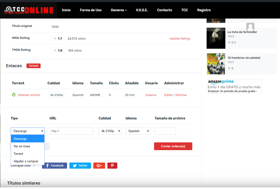 Cualquier usuario registrado en la web podrá insertar un enlace para ver online, comprar o alquilar la película en la ficha de la misma, se permiten cuatro tipos de enlaces, los enlaces serán publicados una vez confirmada su utilidad por el administrador de la web. Gracias por adelantado a todos aquellos usuarios que quieran participar y hacer crecer los servicios de este Sitio web que es de todos.